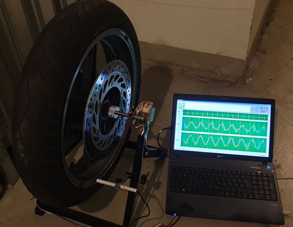 Mein elektronischer Wuchtbock basiert auf einer dynamischen Messung um die Radlager, d.h. die Genauigkeit von Achse und Zentrier-Konussen ist völlig zweitrangig. Es wird ausschließlich die Unwucht des Rads um die Radlager gemessen, also genau die Unwucht, wie sie auch im Betrieb des Motorrads auftritt.