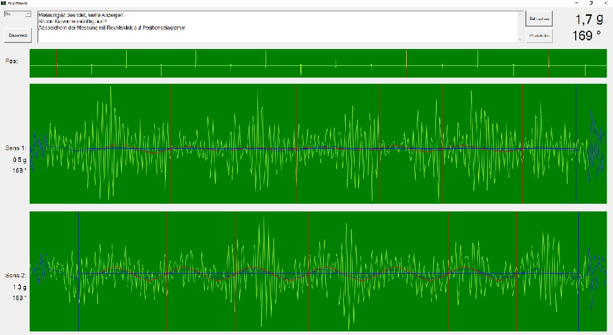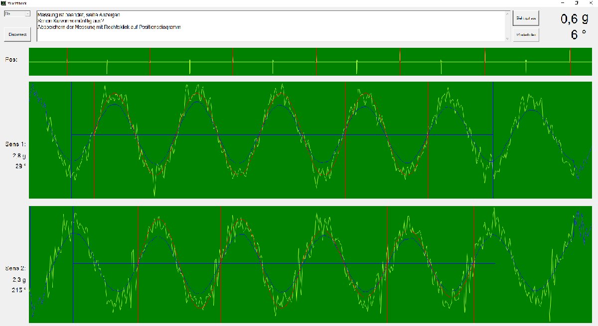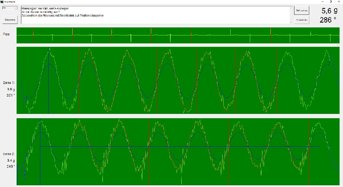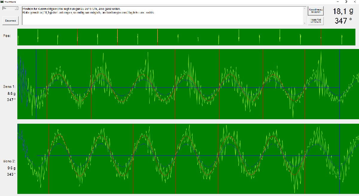 Im Wesentlichen hat die Signalverarbeitung der Software die Aufgabe, aus den Messsignalen der beiden Wägezellen die Sinusfunktion der entsprechenden Messkurven zu ermitteln, was angesichts der stark verrauschten Signale (der hauptsächliche Rauschanteil ist dabei nicht elektrischer Natur sondern rührt von der mechanischen Reibung in den Radlagern) nicht ganz trivial ist. Das ursprüngliche Messsignal darf dabei nämlich weder gedämpft noch in der Phase verschoben werden. Schließlich ist es die Amplitude der Sinuskurve, aus der die Größe der Unwuchtmasse ermittelt wird. Und die Phasenlage des Sinus im Vergleich zu den Daten des Positionssensors gibt Aufschluss über die Lage der Unwucht in Relation zu den am Rad angebrachten Positions-Magneten.
