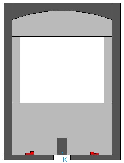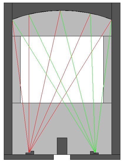Die innere Schicht (dunkelgraue Flächen in Bild 2) begrenzt den Lichtraum im Sensor zu den Seiten hin. Die Seiten und der Bodenbereich sind matt, lediglich der Kreisbogen (mit Kreismittelpunkt "K") an der Oberseite ist verspiegelt. Er reflektiert das von der LED kommende Licht zum Lichtsensor (LED und Sensor jeweils rot markiert), wodurch sich ein Lichtgang wie in Bild 3 ergibt, der das Lichtfeld vollständig abdeckt. Der Block in der Mitte an der Bodenseite ist dazu da, direkten Lichtfluss von der LED zum Sensor zu verhindern, so dass der Sensor also wirklich nur Licht abbekommt, dass über den Spiegel und damit durch das Lichtfeld gegangen ist.